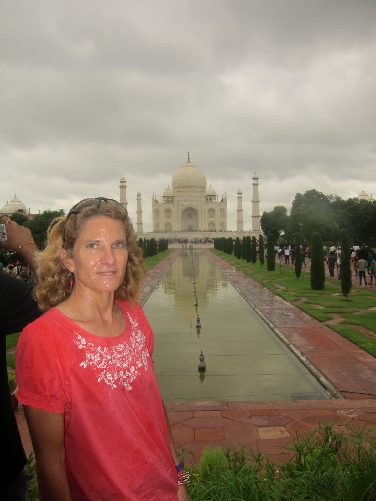 The next day we drove to Agra, which is home to the Taj Mahal. I wish I could say that I was awestruck by the Taj, but the conditions that day made it less so for me. Even though the pictures might not show it, it rained most of the time we were there, so it was hard to get an appreciation for the color of the marble and the intricate designs. It was a holiday weekend, so the crowds were overwhelming. I've never seen so much pushing and shoving; it was so bad that I thought there was going to be a stampede. What I really didn't like were the photo ops. You couldn't go anywhere without photographers bugging you about getting your picture taken, and of course, it was somewhat hard to take pictures because there was always a group getting their pictures taken. I took off from our group and just roamed and found places on the side that were less congested, and where families were lazing around in the grass.